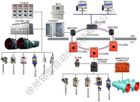 礦用智能通風(fēng)監(jiān)控系統(tǒng)應(yīng)用工業(yè)計算機(jī)及PLC技術(shù)對礦用通風(fēng)機(jī)進(jìn)行連續(xù)在線監(jiān)控并結(jié)合視頻聯(lián)動技術(shù)實現(xiàn)主通風(fēng)機(jī)不停風(fēng)倒機(jī)、故障自動倒機(jī)。系統(tǒng)同時具備高壓無擾動快切功能,當(dāng)運(yùn)行高壓電源突發(fā)故障,停止供電時,系統(tǒng)自動切換到備用高壓,保障風(fēng)機(jī)不停機(jī),進(jìn)一步保證整個主通風(fēng)系統(tǒng)的安全。在線監(jiān)控的風(fēng)機(jī)運(yùn)行參數(shù)包括:風(fēng)機(jī)入口靜壓、全壓、風(fēng)速、流量、入口溫度(即井下出氣溫度)、電機(jī)振動、軸承溫度、定子繞組溫度、電機(jī)輸入電壓、電流、轉(zhuǎn)速、功率和總功率、風(fēng)機(jī)效率、正反風(fēng)信號等。系統(tǒng)保障通風(fēng)機(jī)的安全運(yùn)行和方便通風(fēng)機(jī)的性能測試,根據(jù)通風(fēng)機(jī)操作流程實現(xiàn)通風(fēng)系統(tǒng)的無人值守。